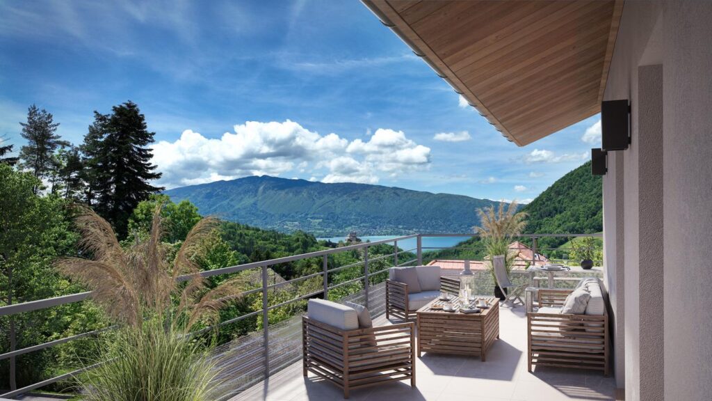 Ici, les habitants profitent d’une terrasse à ciel ouvert ou d’un balcon d’angle qui prolongent avec amplitude tous les intérieurs. Aussi agréables qu’intimistes, ces pièces de vie additionnelles offrent de splendides panoramas sur le lac, les montagnes ou sur le château de Menthon-Saint-Bernard pour des instants de contemplation assurés.