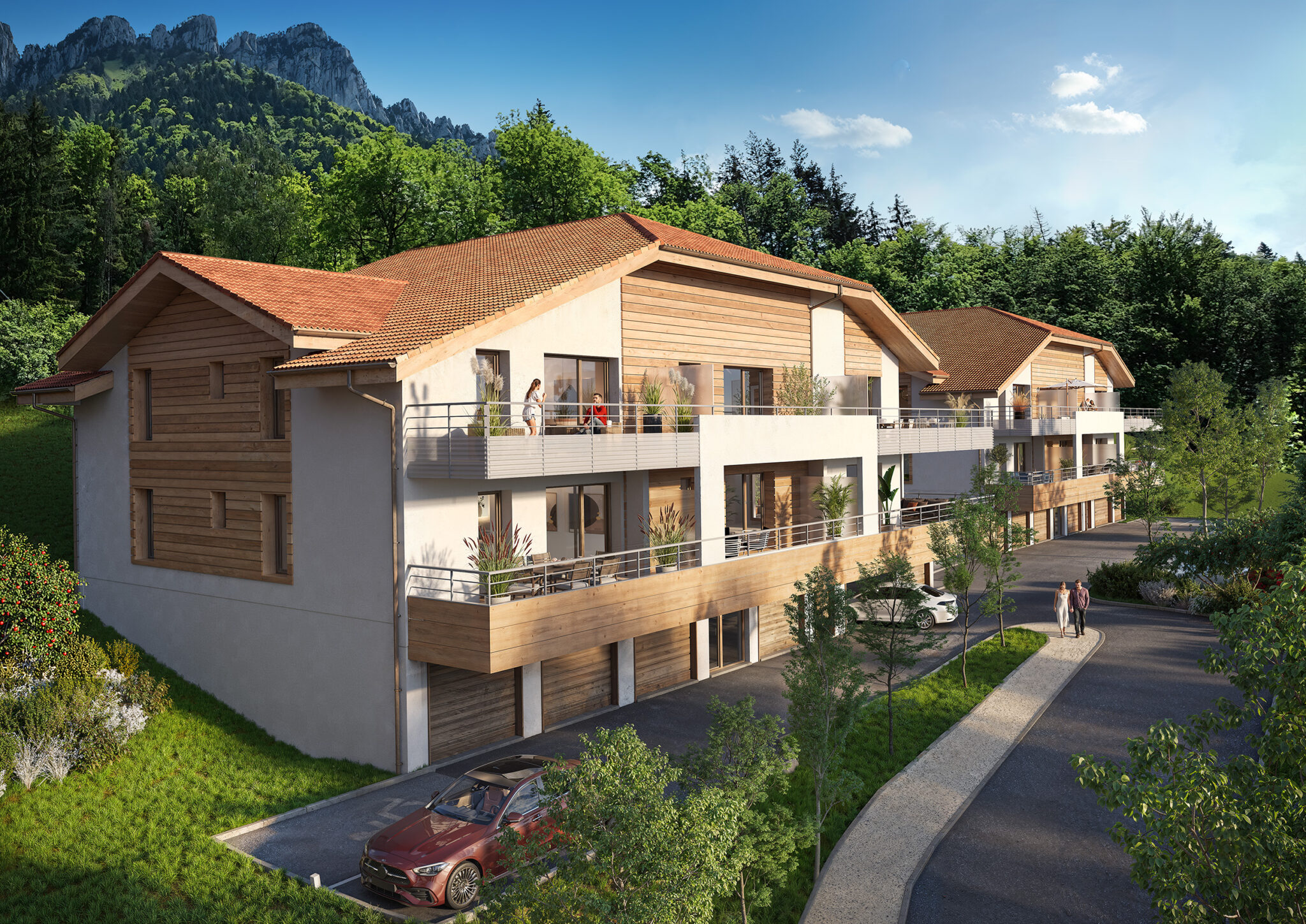 Épousant la pente douce du terrain et intégrés avec discrétion dans le paysage existant, les 4 petits îlots de ce programme immobilier accueillent une sélection de seulement 23 appartements disponibles à la vente. Dans un style entre modernité et tradition, la résidence s’inspire de l’architecture traditionnelle des chalets typiques de Haute-Savoie : toitures à larges pans avec débords, séquences bardées de bois, enduits de teintes claires…